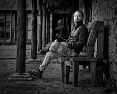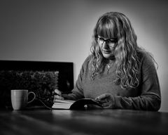 The portraits that follow are drawn in the style that has long fascinated me: stark, monochrome images in the tradition of film noir. In this world of shadow and light, mystery is heightened, the ordinary is transformed, and every expression seems to conceal as much as it reveals. Faces emerge from darkness, hands linger over the journal, and the stillness of a page suggests a story just begun or perhaps already ended. See what narrative you craft from this wee glimmer of light.